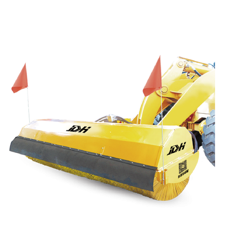 除雪滚刷采用双侧液压摆线马达驱动;滚刷支撑轮采用充气轮胎;滚刷颜色为工程黄,两端配有警示旗帜,除雪滚刷直径大,转速快,滚刷采优质刷毛,耐磨损,使用寿命长,车辆与设备采用驶入式快速连接。